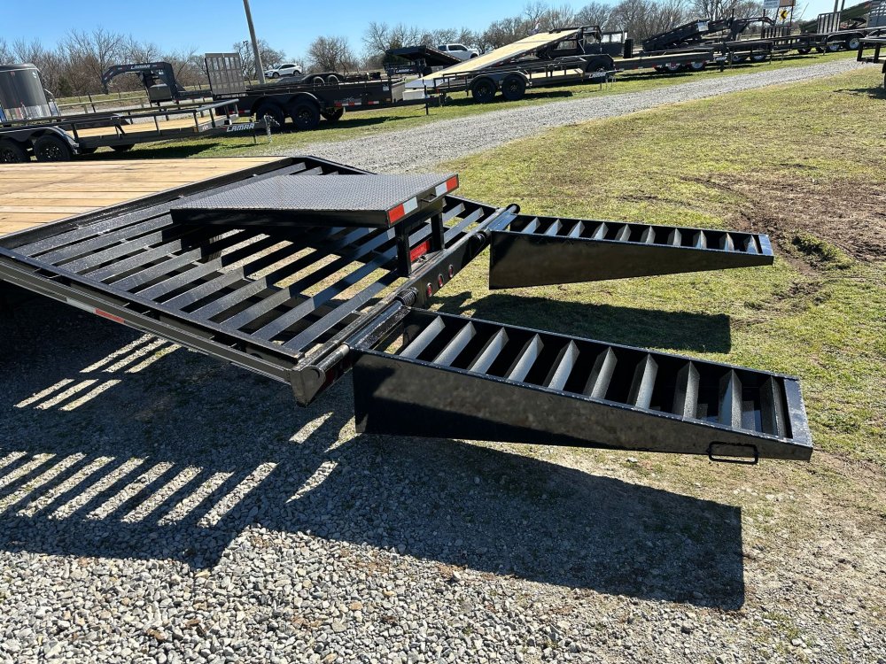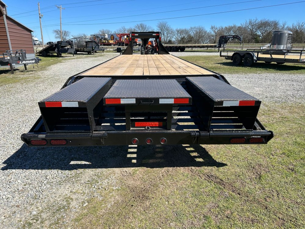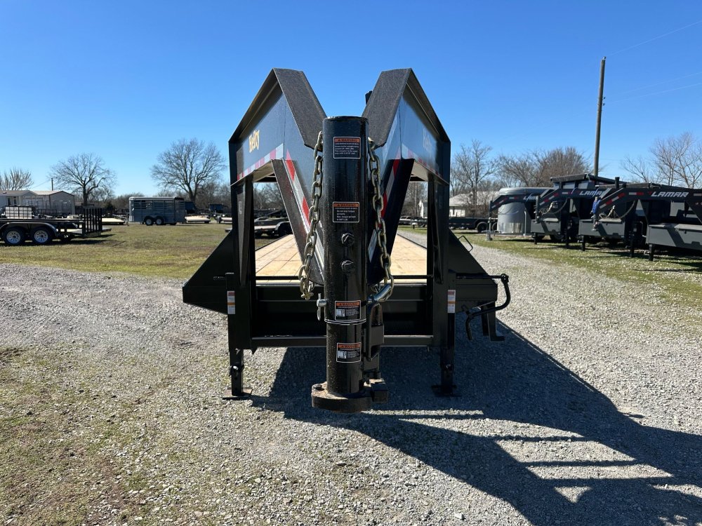 GOOSENECK. 7K EZ LUBE ELECTRIC BRAKE AXLES. DUAL 10K DROPLEG JACKS. WOOD FLOOR. HEAVY DUTY FLIP OVER RAMPS. BLACK PAINT. STAKE POCKETS. RUB RAIL. 235/80 R16 SILVER WHEELS. 10 PLY TIRES.
