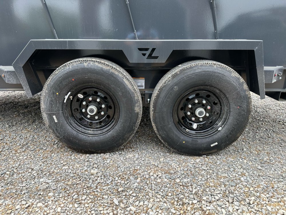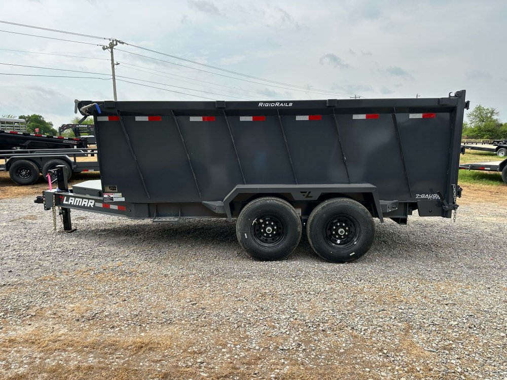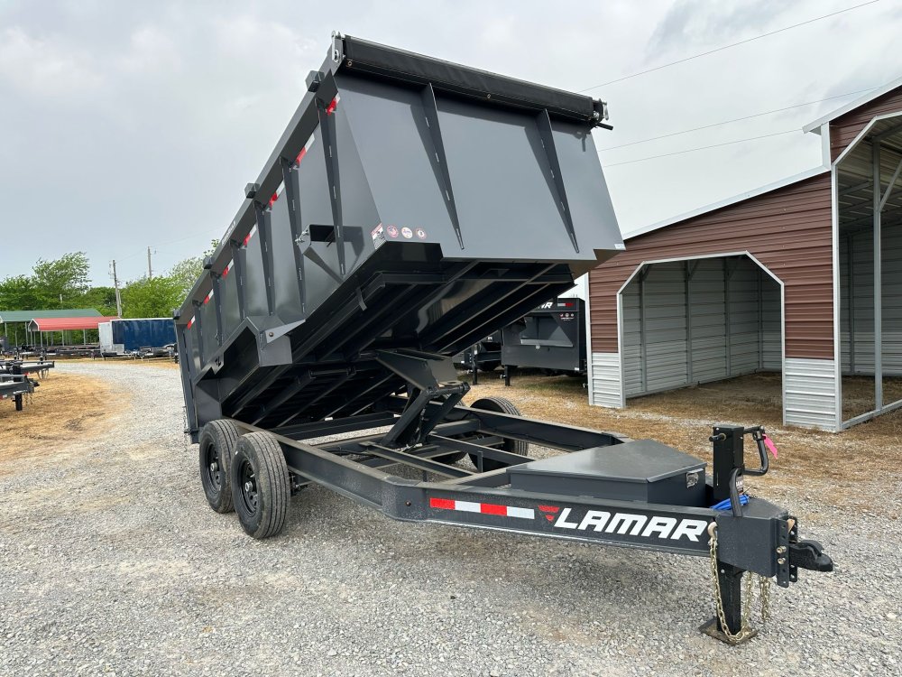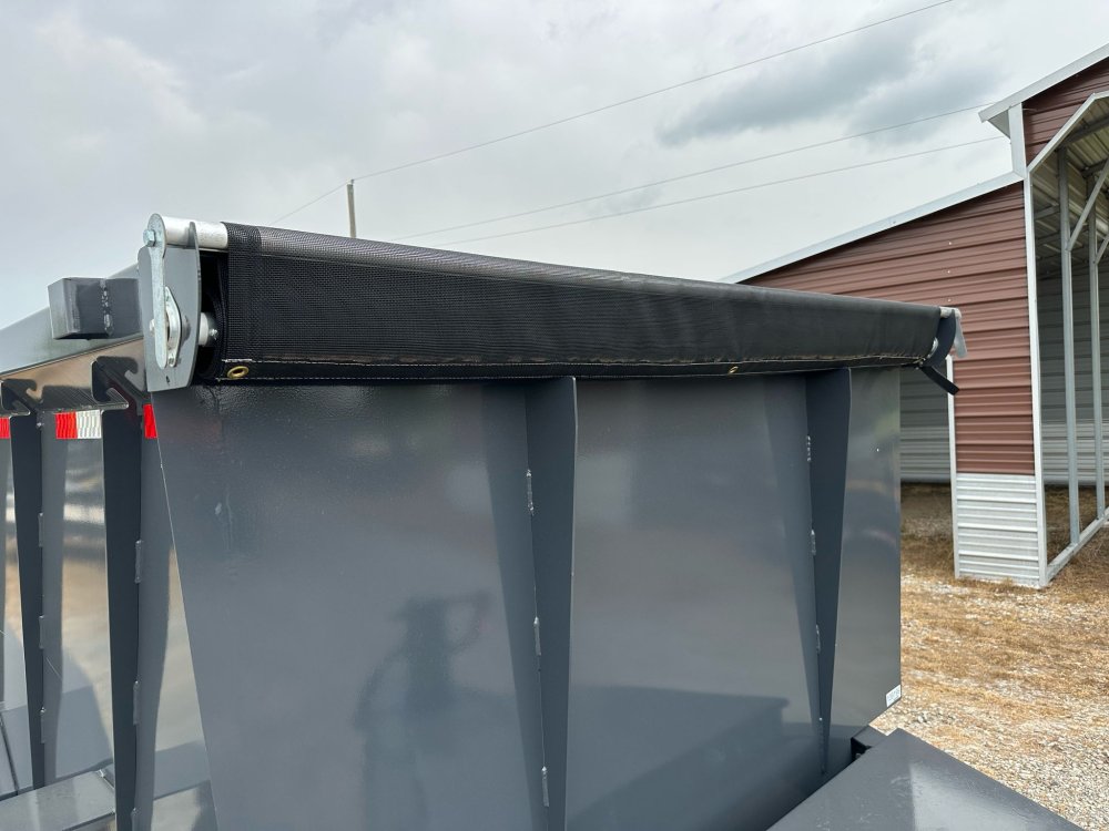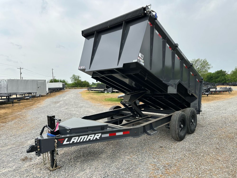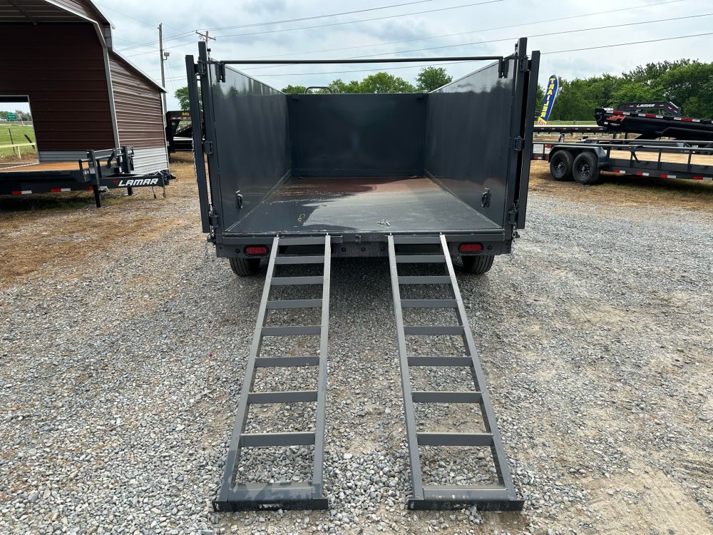 BUMPER PULL. 7K EZ LUBE ELECTRIC BRAKE SPRING AXLE(S). 235/85 R16 (G) 14PLY TIRE WITH BLACK WHEEL. 235/85 R16 (G) 14PLY SPARE TIRE WITH BLACK WHEEL & MOUNT. 2-5/16" 21K DEMCO ADJ CAST COUPLER. SINGLE 10K DROP-LEG JACK. FRONT TOOL BOX. SPREADER GATE. PAIR OF HEAVY DUTY SLIDE IN RAMPS. FENDERS. 48" WELD-ON SIDES. STANDARD STAKE POCKETS. FOUR WELD ON D-RINGS. 8" 13 LB I-BEAM FRAME. 12" CENTER-TO-CENTER CROSSMEMBERS. NO SHOVEL & RAKE RACK. 3 WAY 12V DC PUMP. DEFAULT REMOTE. MESH TARP WITH PULL BAR. WIRING. LED PACKAGE. 12V DEEP CYCLE BATTERY KIT. 5 AMP TRICKLE CHARGER. DECAL PACKAGE. LAMAR GRAY POWDER COAT. 14000 GVWR