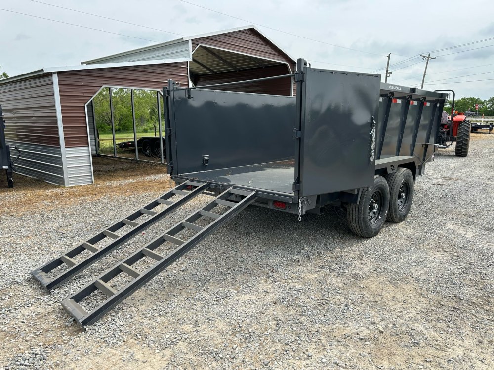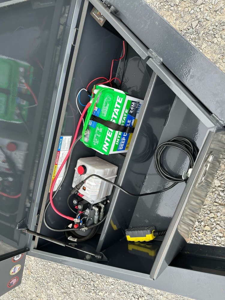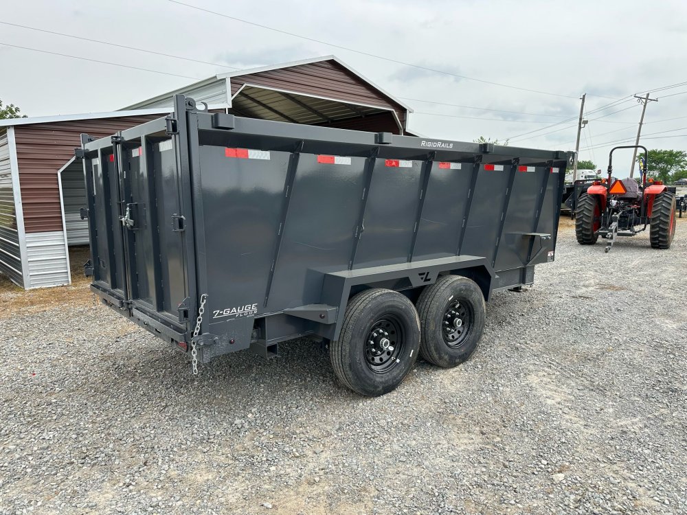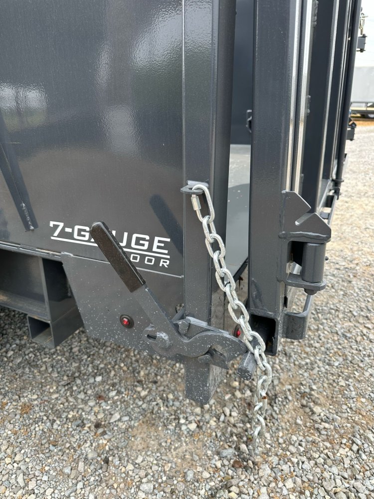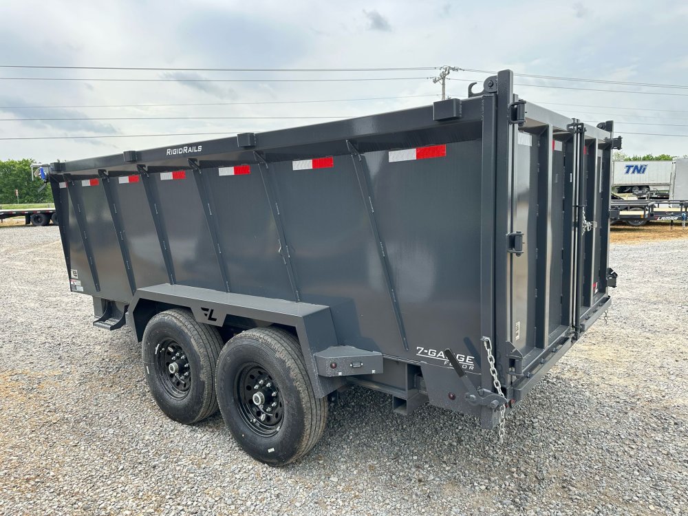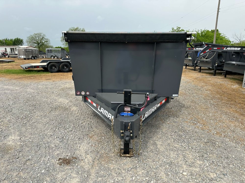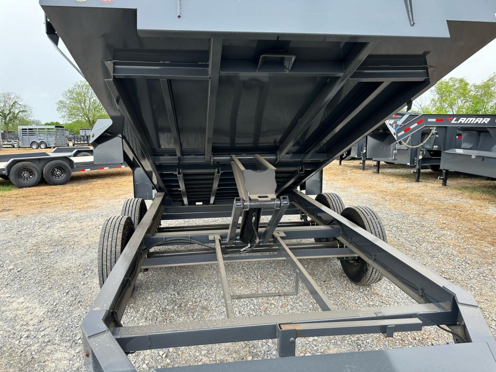 BUMPER PULL. 7K EZ LUBE ELECTRIC BRAKE SPRING AXLE(S). 235/85 R16 (G) 14PLY TIRE WITH BLACK WHEEL. 235/85 R16 (G) 14PLY SPARE TIRE WITH BLACK WHEEL & MOUNT. 2-5/16" 21K DEMCO ADJ CAST COUPLER. SINGLE 10K DROP-LEG JACK. FRONT TOOL BOX. SPREADER GATE. PAIR OF HEAVY DUTY SLIDE IN RAMPS. FENDERS. 48" WELD-ON SIDES. STANDARD STAKE POCKETS. FOUR WELD ON D-RINGS. 8" 13 LB I-BEAM FRAME. 12" CENTER-TO-CENTER CROSSMEMBERS. NO SHOVEL & RAKE RACK. 3 WAY 12V DC PUMP. DEFAULT REMOTE. MESH TARP WITH PULL BAR. WIRING. LED PACKAGE. 12V DEEP CYCLE BATTERY KIT. 5 AMP TRICKLE CHARGER. DECAL PACKAGE. LAMAR GRAY POWDER COAT. 14000 GVWR