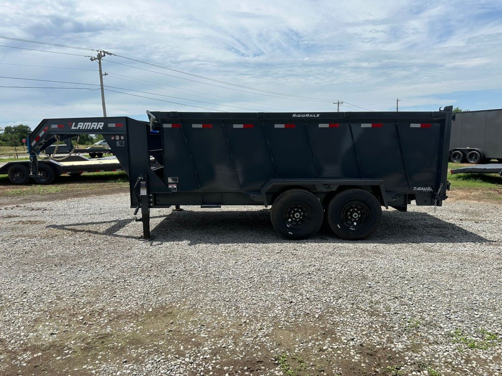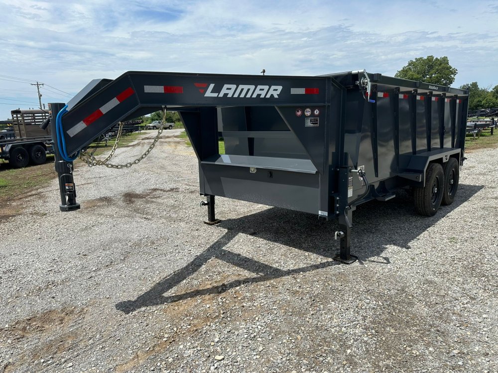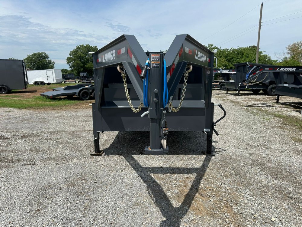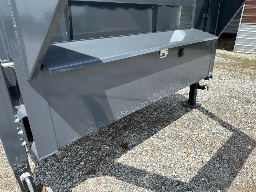 GOOSENECK. 7K EZ LUBE ELECTRIC BRAKE SPRING AXLE(S). 235/85 R16 (G) 14PLY TIRE WITH BLACK WHEEL. 235/85 R16 (G) 14PLY TIRE WITH BLACK WHEEL. 2-5/16" 30K GOOSENECK COUPLER. REGULAR HEIGHT NECK & COUPLER. DUAL 10K DROP-LEG JACKS. FRONT TOOL BOX. SPREADER GATE. PAIR OF HEAVY DUTY SLIDE IN RAMPS. FENDERS. 48" WELD-ON SIDES. STANDARD STAKE POCKETS. FOUR WELD ON D-RINGS. 8" 13 LB I-BEAM FRAME. 12" CENTER-TO-CENTER CROSSMEMBERS. 3 WAY 12V DC PUMP. DEFAULT REMOTE. MESH TARP WITH PULL BAR. WIRING. LED PACKAGE. 12V DEEP CYCLE BATTERY KIT. 5 AMP TRICKLE CHARGER. DECAL PACKAGE. LAMAR GRAY POWDER COAT. 14000 GVWR