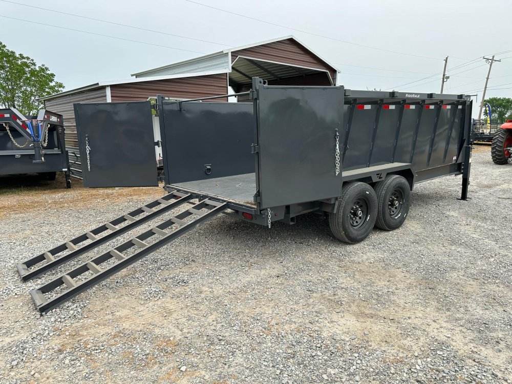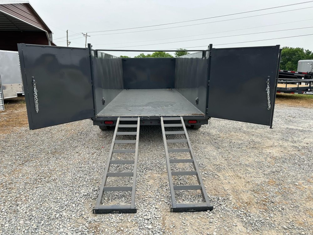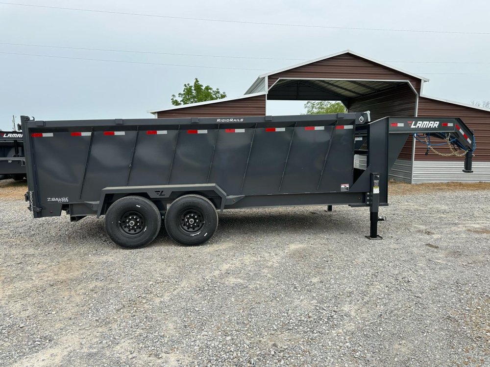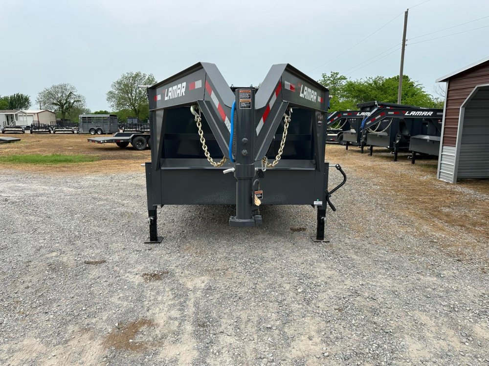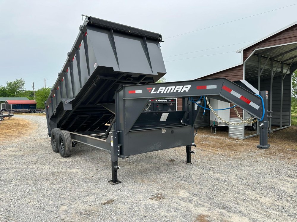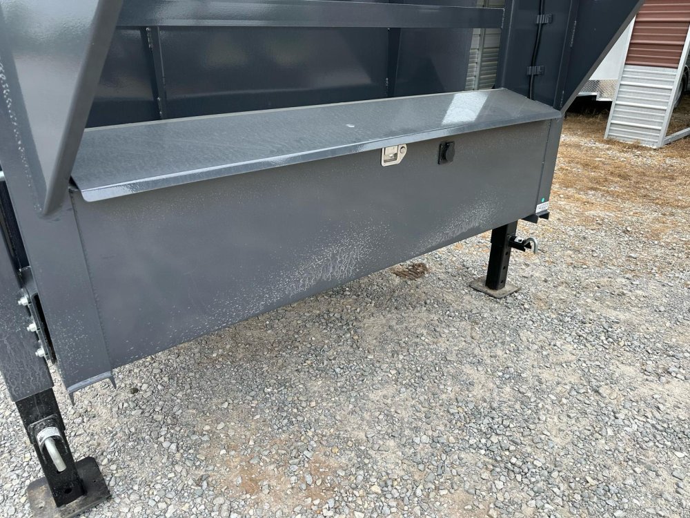 GOOSENECK. 7K EZ LUBE ELECTRIC BRAKE SPRING AXLE(S). 235/85 R16 (G) 14PLY TIRE WITH BLACK WHEEL. 235/85 R16 (G) 14PLY TIRE WITH BLACK WHEEL. 2-5/16" 30K GOOSENECK COUPLER. REGULAR HEIGHT NECK & COUPLER. DUAL 10K DROP-LEG JACKS. FRONT TOOL BOX. SPREADER GATE. PAIR OF HEAVY DUTY SLIDE IN RAMPS. FENDERS. 48" WELD-ON SIDES. STANDARD STAKE POCKETS. FOUR WELD ON D-RINGS. 8" 13 LB I-BEAM FRAME. 12" CENTER-TO-CENTER CROSSMEMBERS. 3 WAY 12V DC PUMP. DEFAULT REMOTE. MESH TARP WITH PULL BAR. WIRING. LED PACKAGE. 12V DEEP CYCLE BATTERY KIT. 5 AMP TRICKLE CHARGER. DECAL PACKAGE. LAMAR GRAY POWDER COAT. 14000 GVWR