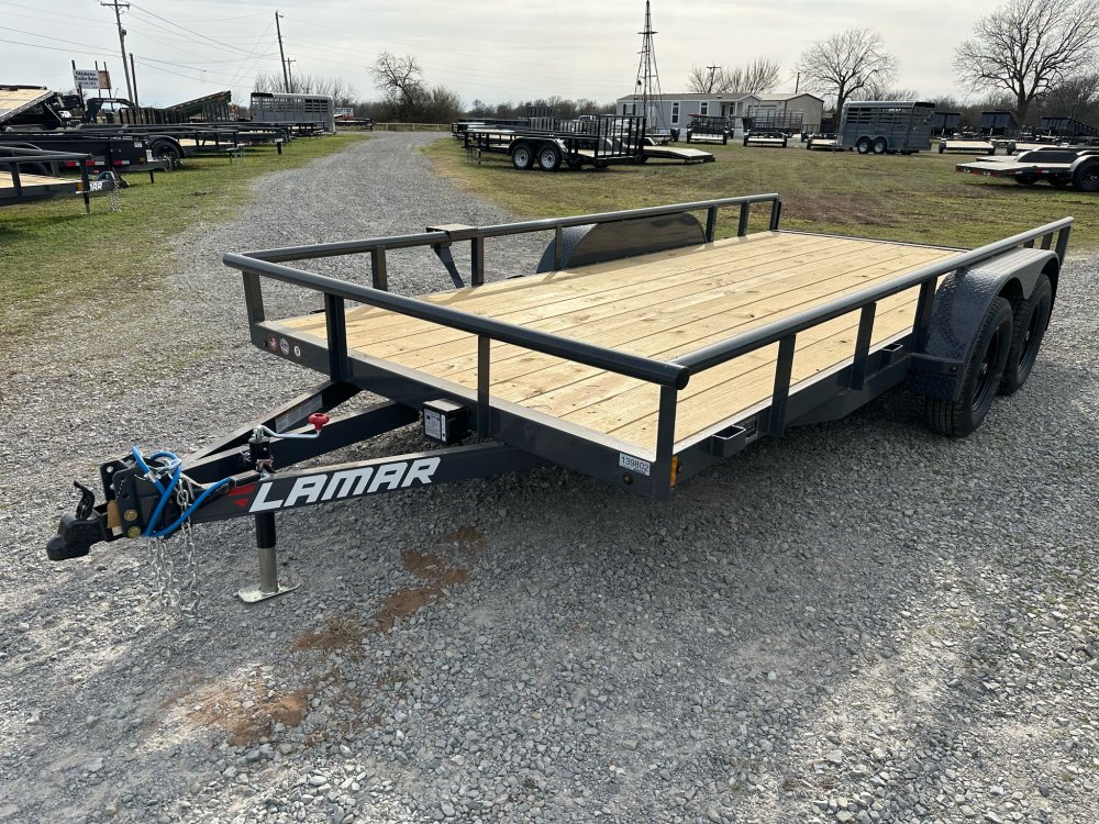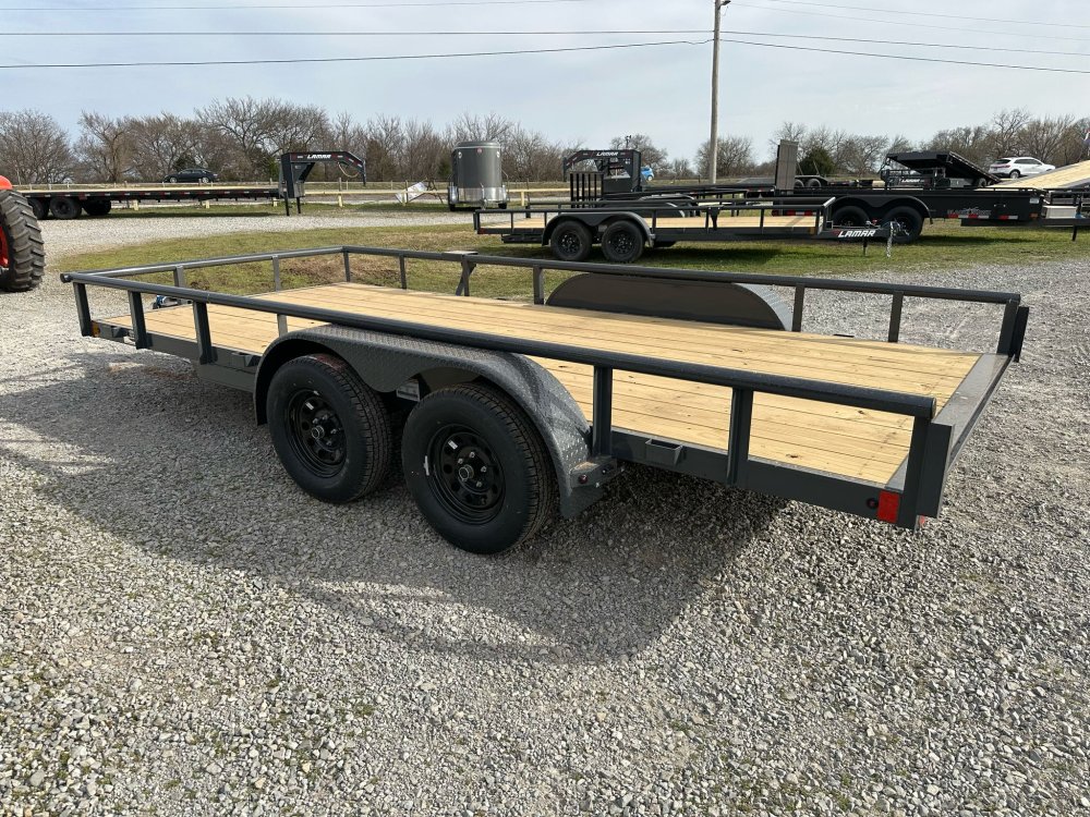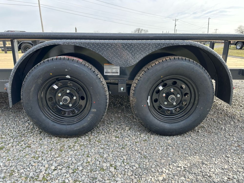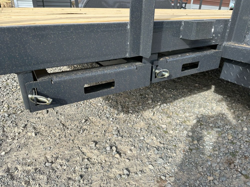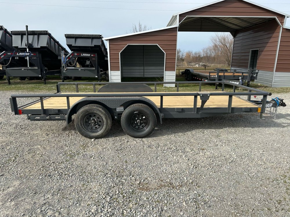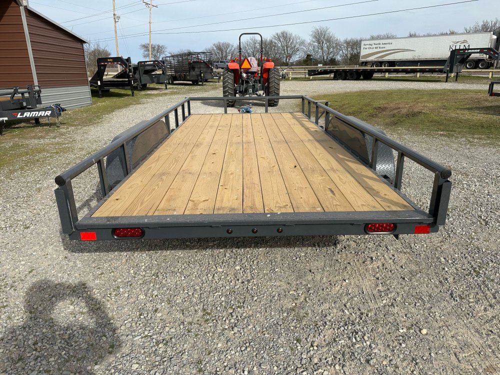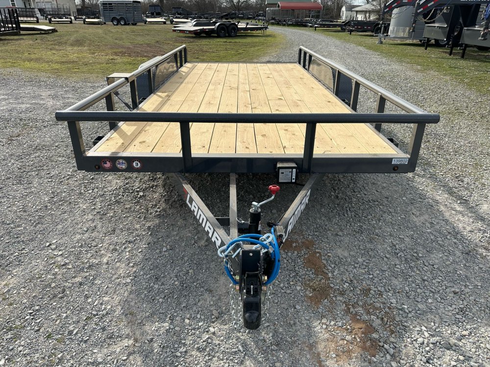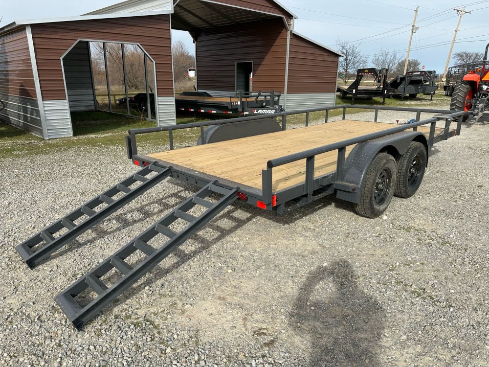 BUMPER PULL. 3.5K EZ LUBE IDLER SPRING AXLE & ELECTRIC BRAKE SPRING AXLE. 205/75 R15 (C) 6PLY TIRE WITH BLACK WHEEL. SPARE TIRE MOUNT. 2" 10K DEMCO ADJ CAST COUPLER. 2K TOP-WIND FLIP JACK. WRAP TONGUE. STRAIGHT DECK. PAIR OF SLIDE-IN RAMPS. ROUND DIAMOND PLATE TEARDROP FENDERS. STANDARD HEIGHT SIDE RAILS. 2-3/8" PIPE TOPRAIL. STANDARD STAKE POCKETS. 4" CHANNEL FRAME. 24" CENTER-TO-CENTER CROSSMEMBERS. TREATED YELLOW PINE FLOOR. WIRING. LED PACKAGE. DECAL PACKAGE. LAMAR GRAY POWDER COAT.